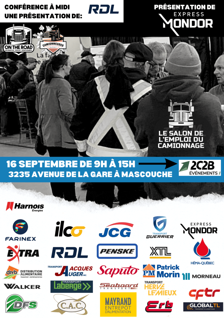 La deuxième édition du Salon de l’emploi du Camionnage se tiendra le 16 septembre prochain à Mascouche au 4ème étage du «2C2B Événements» au 3235 avenue de la Gare. C’est le deuxième concept de nos salons. Une formule plus intime avec 25 exposants qui se partageront une superbe salle avec une terrasse extérieure pour discuter plus formellement.